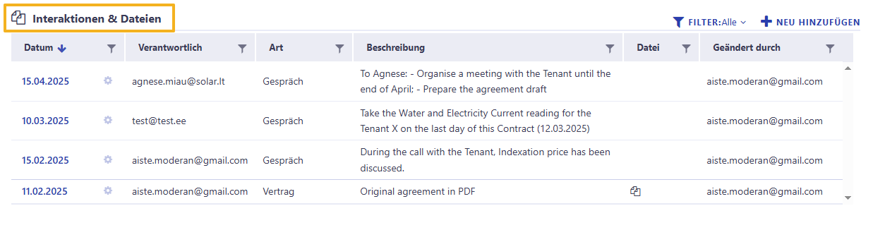 Moderan bietet Ihnen die Möglichkeit, alle Arten von Dokumenten und Ereignissen im Zusammenhang mit Mietanfragen, Verträgen und Gebäuden im Block „Interaktionen und Dateien“ zu speichern.