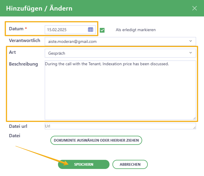 • Verantwortlich - Standardmäßig erscheint hier die E-Mail-Adresse der Person, die den Eintrag anlegt. Sie können aber auch jeden anderen aktiven Nutzer auswählen.