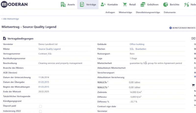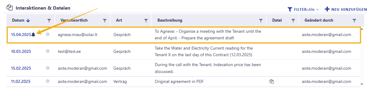 Wir empfehlen dringend, die Liste der Vertragsdokumente und Protokolle sorgfältig zu pflegen (z. B. Vertragszusätze bezüglich Flächenänderungen oder Änderungen der Monatsmiete) und die Erinnerungsfunktion zu nutzen, um sich selbst (oder andere aktive Nutzer) an mögliche Änderungen der Vertragsbedingungen nach Verhandlungen zu erinnern.