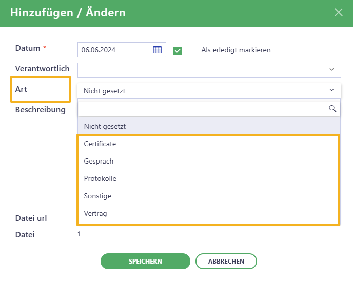 • Art - Wählen Sie die Art der Datei, die Sie hochladen möchten (z.B. Vertrag).