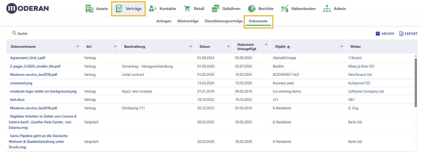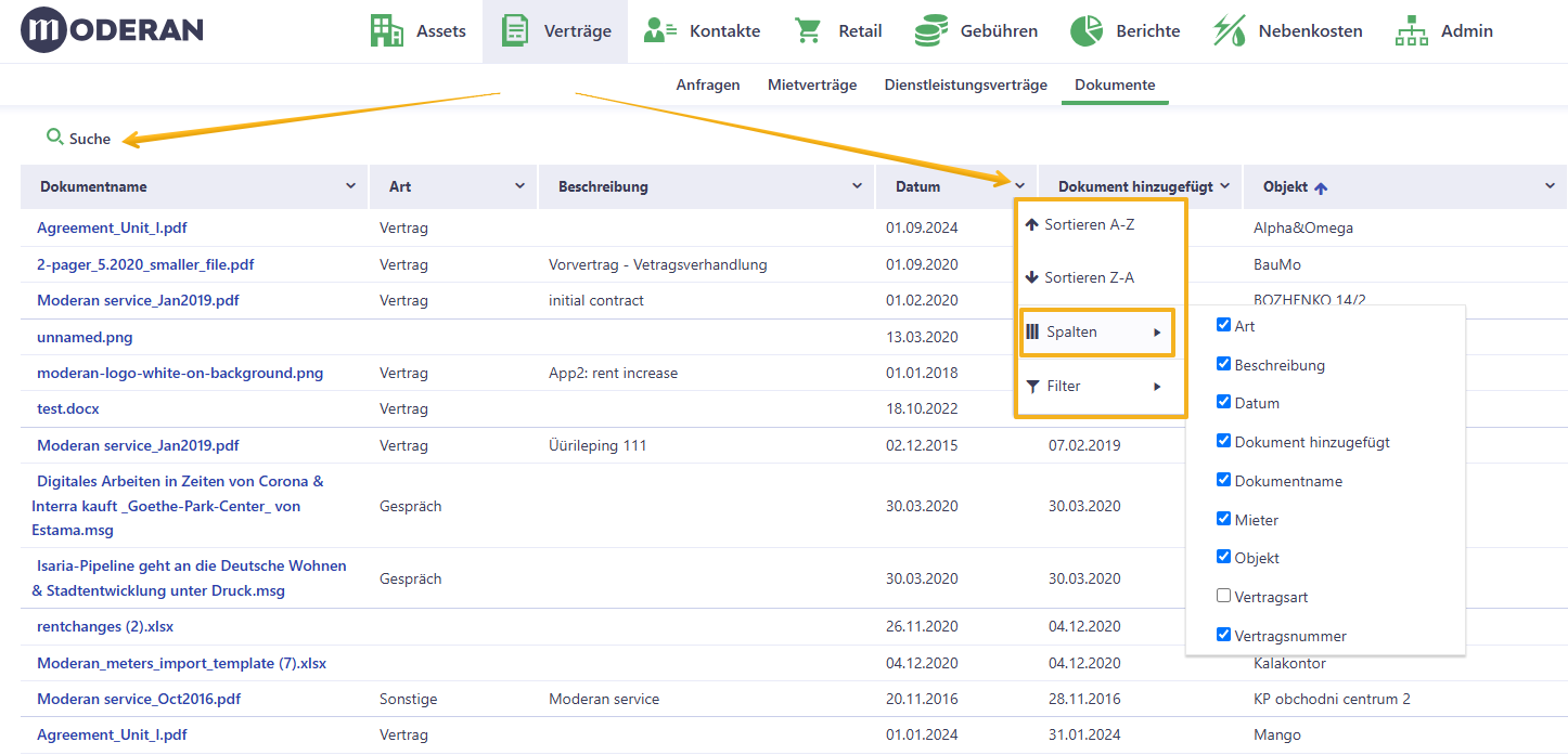 • Sie können Dokumente nach bestimmten Kriterien filtern (Dateiname, Art, Datum, Objekt, etc.);