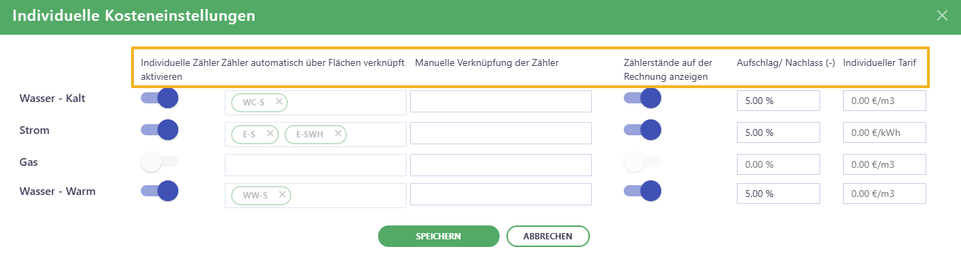 • Individuelle Zähler aktivieren: Deaktivieren Sie die Zähler für jene Kostenarten, die keine individuellen Zähler haben. Dadurch wird die Darstellung auf der Seite Zählerstände weitaus übersichtlicher.
