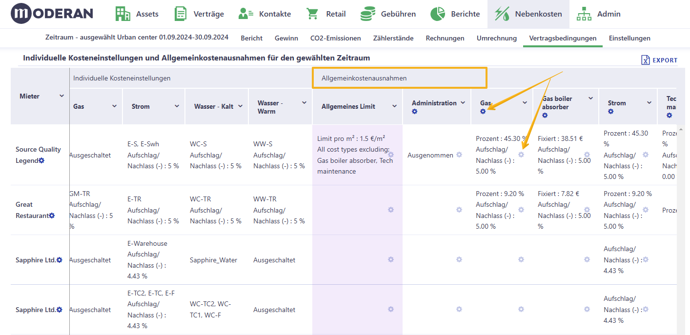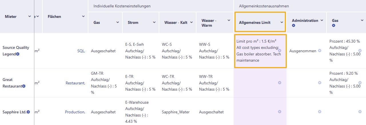 Die rosa unterlegte Spalte Allgemeines Limit ermöglicht es, Ausnahmen für einen Mieter für alle Kostenarten auf einmal anzulegen. Klicken Sie hierfür auf das Zahnrad-Symbol in der Zeile des jeweiligen Mieters: