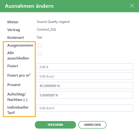 Es ist möglich, für jede allgemeinen Kostenart Ausnahmen zu definieren - für alle Mietverträge gleichzeitig und/oder für jeden einzelnen Mieter/Mietvertrag: