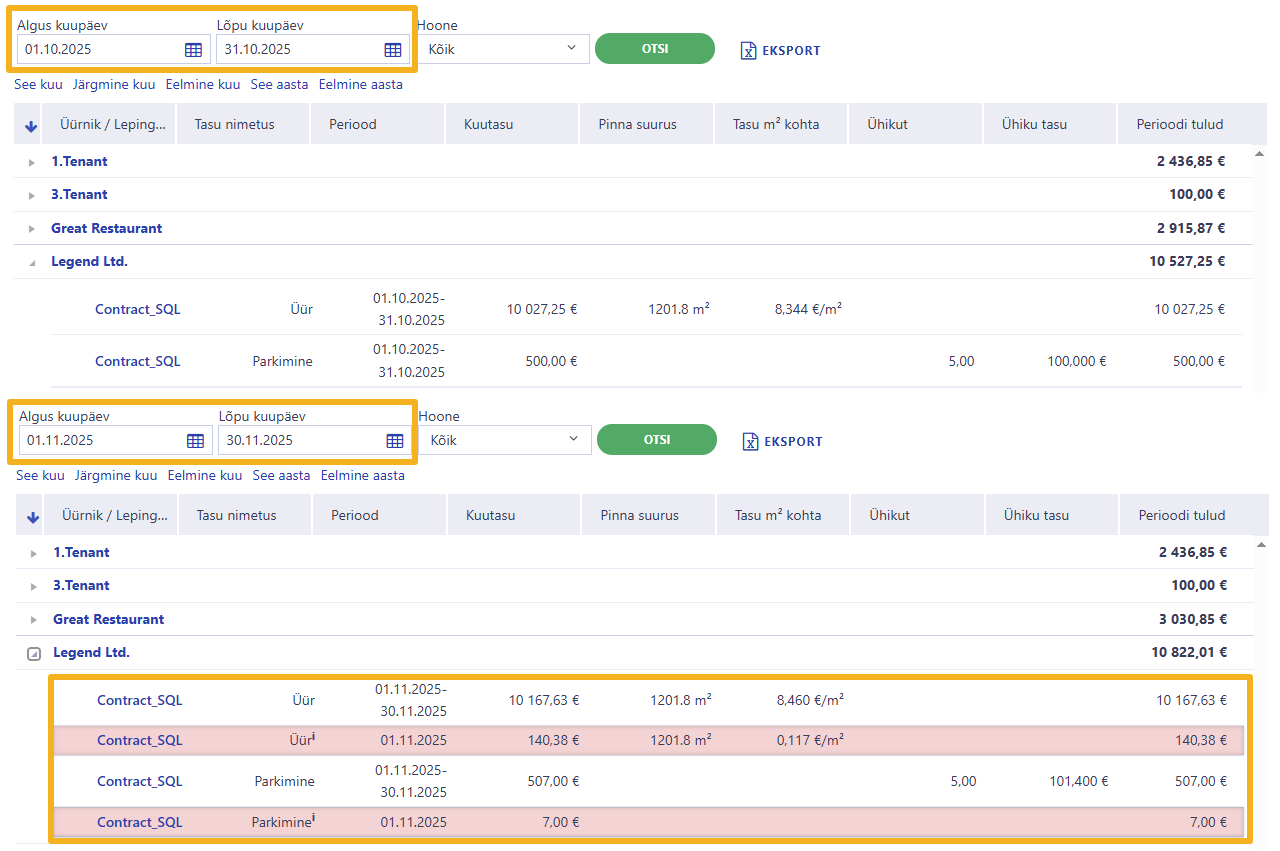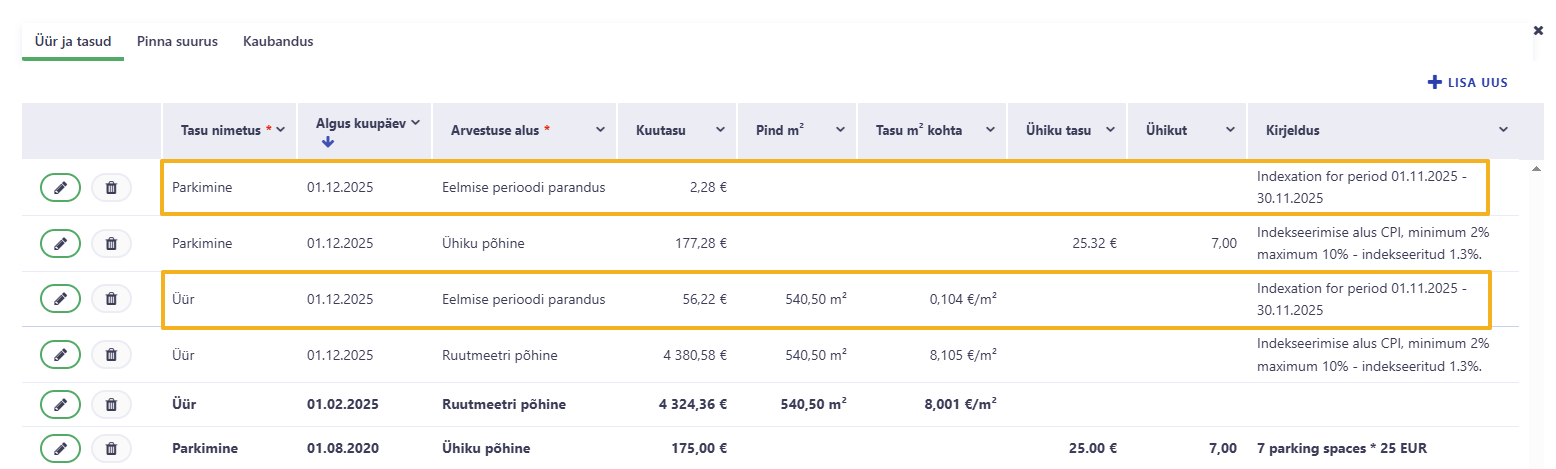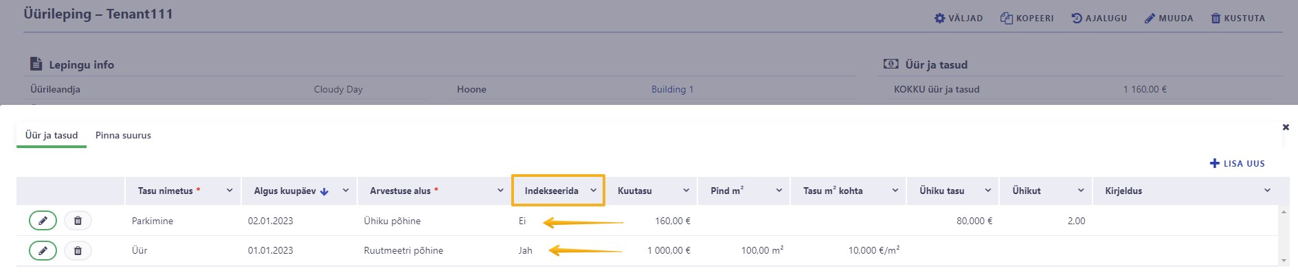 • Lepingu arveldustüübid indekseeritakse 1 kuu enne järgmist indekseerimiskuupäeva lepingu üüride ja tasude ruudustikus lisatud ridadega kirjeldusega „Indekseeritud automaatselt 1 kuu ette, indeks: %