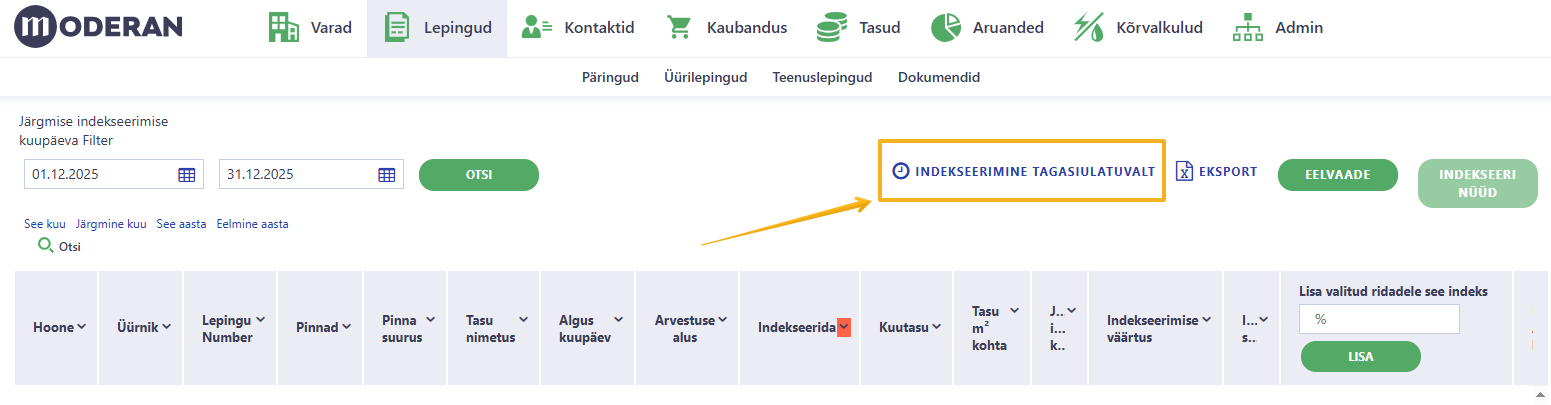 Liigu menüüs Lepingud > Üürilepingud > % ALUSTA INDEKSEERIMIST > INDEKSEERIMINE TAGASIULATUVALT