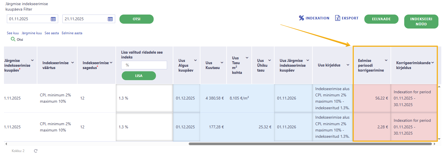 NB! Pärast indekseerimise rakendamist ei ole seda toimingut võimalik tagasi pöörata ja kõik parandused tuleb teha käsitsi igal Üürilepingu tasu real.