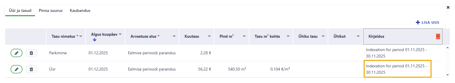 - Klikkides INDEKSEERI NÜÜD, luuakse sisestatud parameetrite järgi uued tasu read Üürilepingutesse Üür ja tasud tabelisse.