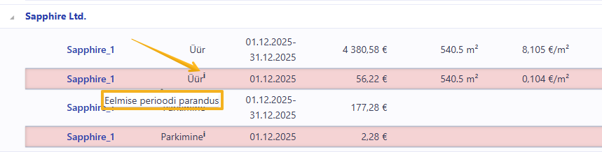 Kaks lisaveergu, mis on esile tõstetud roosaga - Eelmise perioodi korrigeerimine ja Korrigeerimiskande kirjeldus - näitavad täiendavaid summasid, mis lisatakse tasu reale ja lähevad üürniku veebruari arvele jaanuari perioodi eest.
