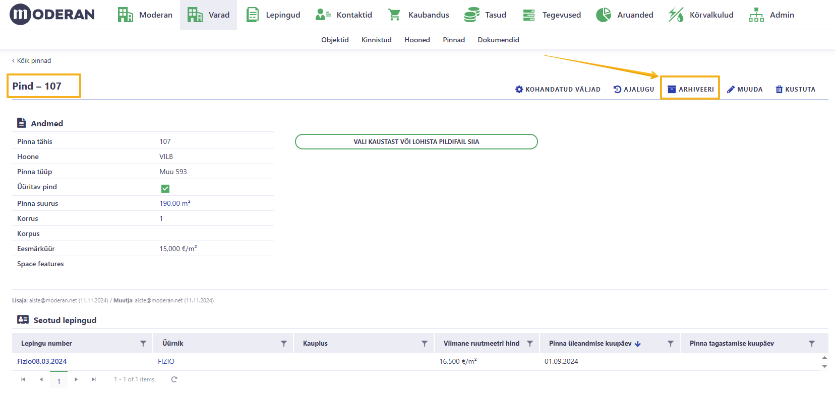 - Is automatically moved into the ARCHIVE section in Assets > Spaces list view. The archived Spaces remain visible in Moderan for historical reporting. This ensures that reports referencing past leases and space usage remain intact.